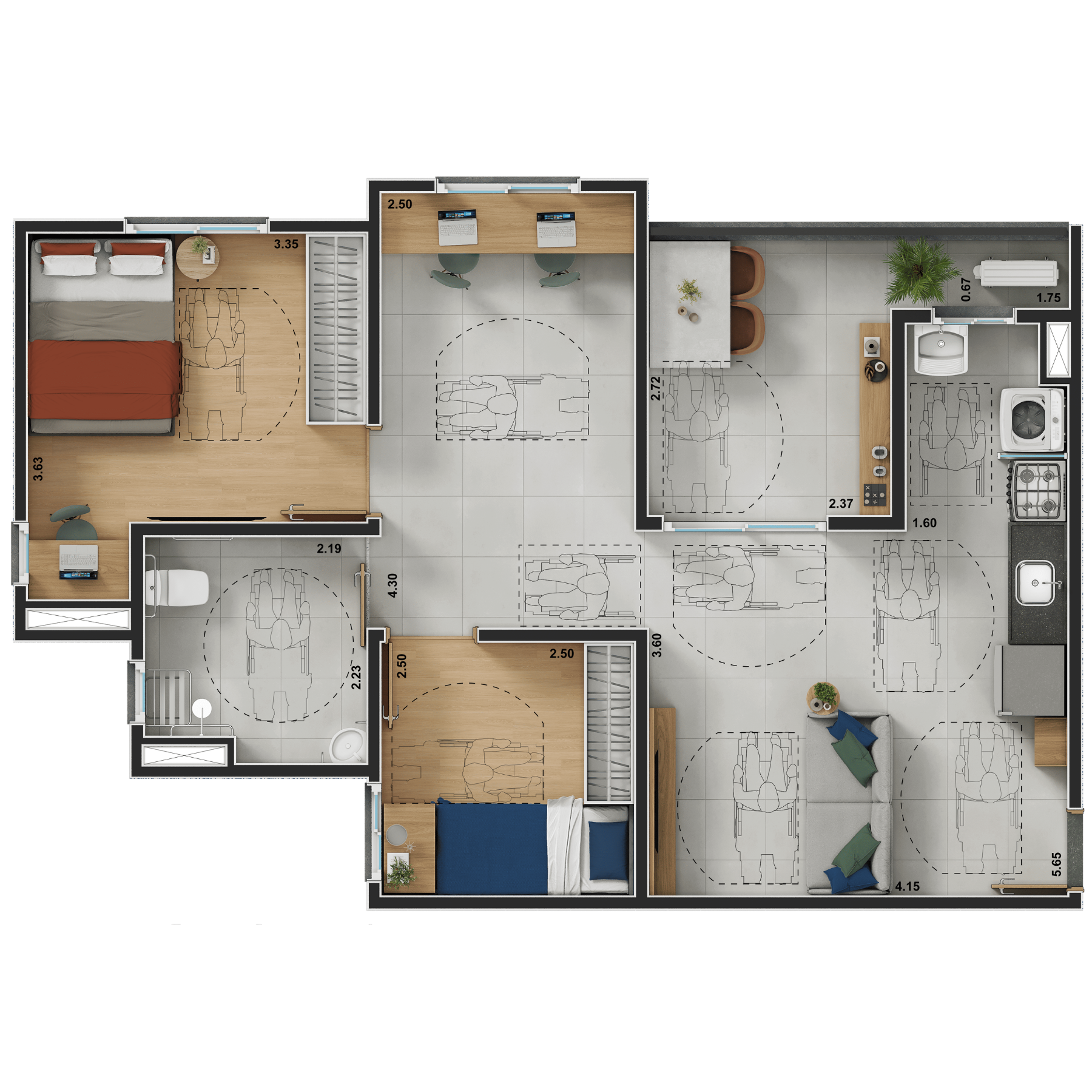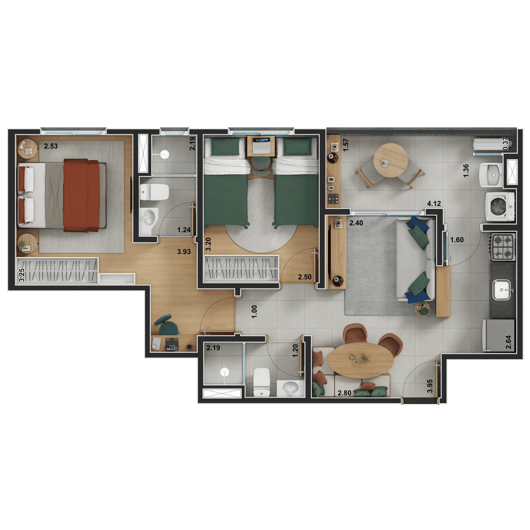 Tipo 02(térreo): 56,04+(36 a 41)m²